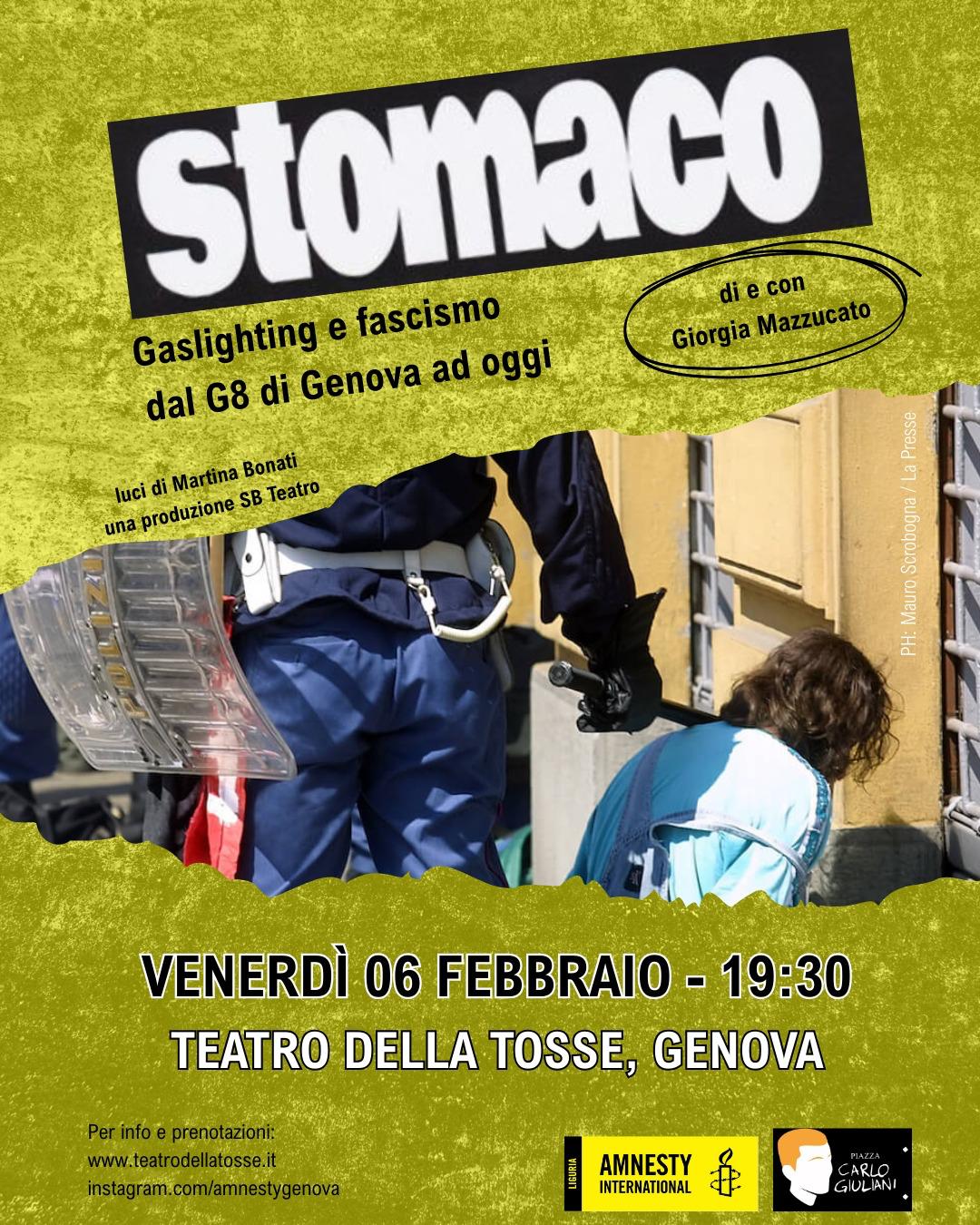 Venerdì 6 febbraio, ore 19:30 – Teatro della Tosse – Genova Amnesty International Genova e Comitato Piazza Carlo Giuliani odv presentano “Stomaco”, di e con Giorgia Mazzucato Un monologo intenso…
